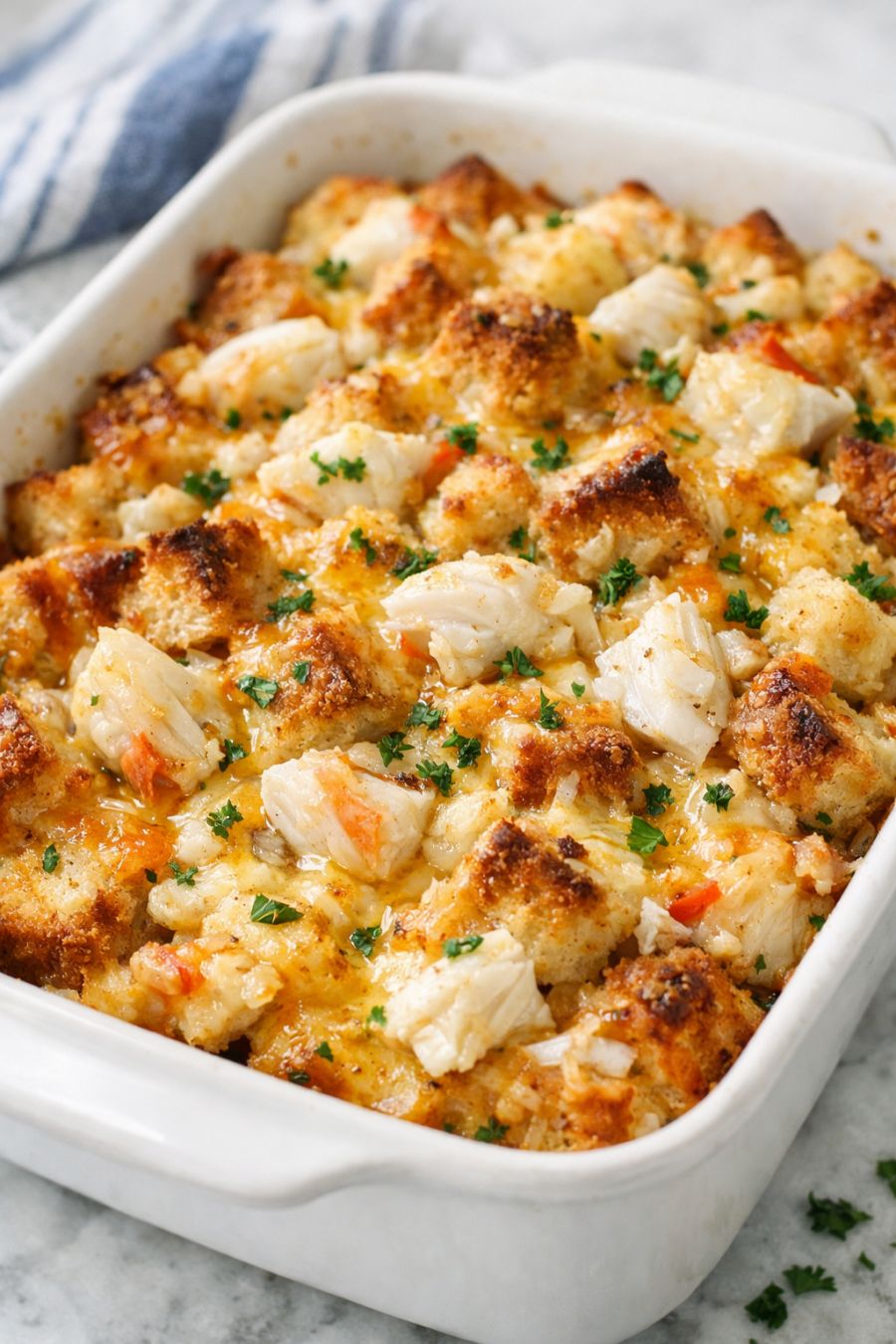 Once cooked, turn off the slow cooker and let the crab bread pudding rest, covered, for 10 to 15 minutes. This helps it firm up slightly and makes it easier to scoop.