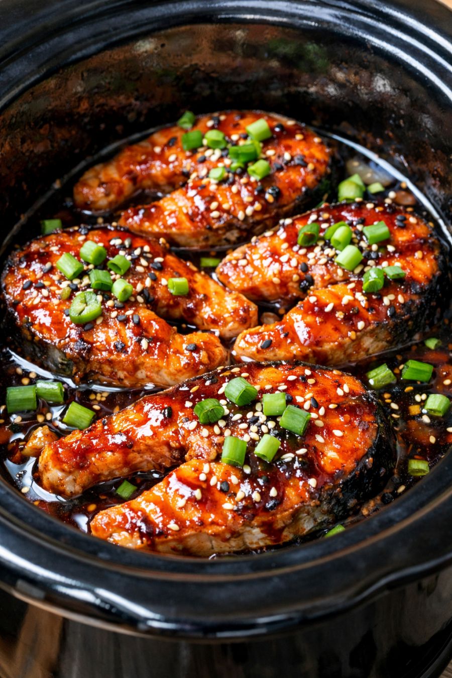 Taste the sauce in the slow cooker and adjust seasoning if needed with a splash more soy sauce for salt or a drizzle of honey for sweetness, then serve the salmon hot with your favorite sides.