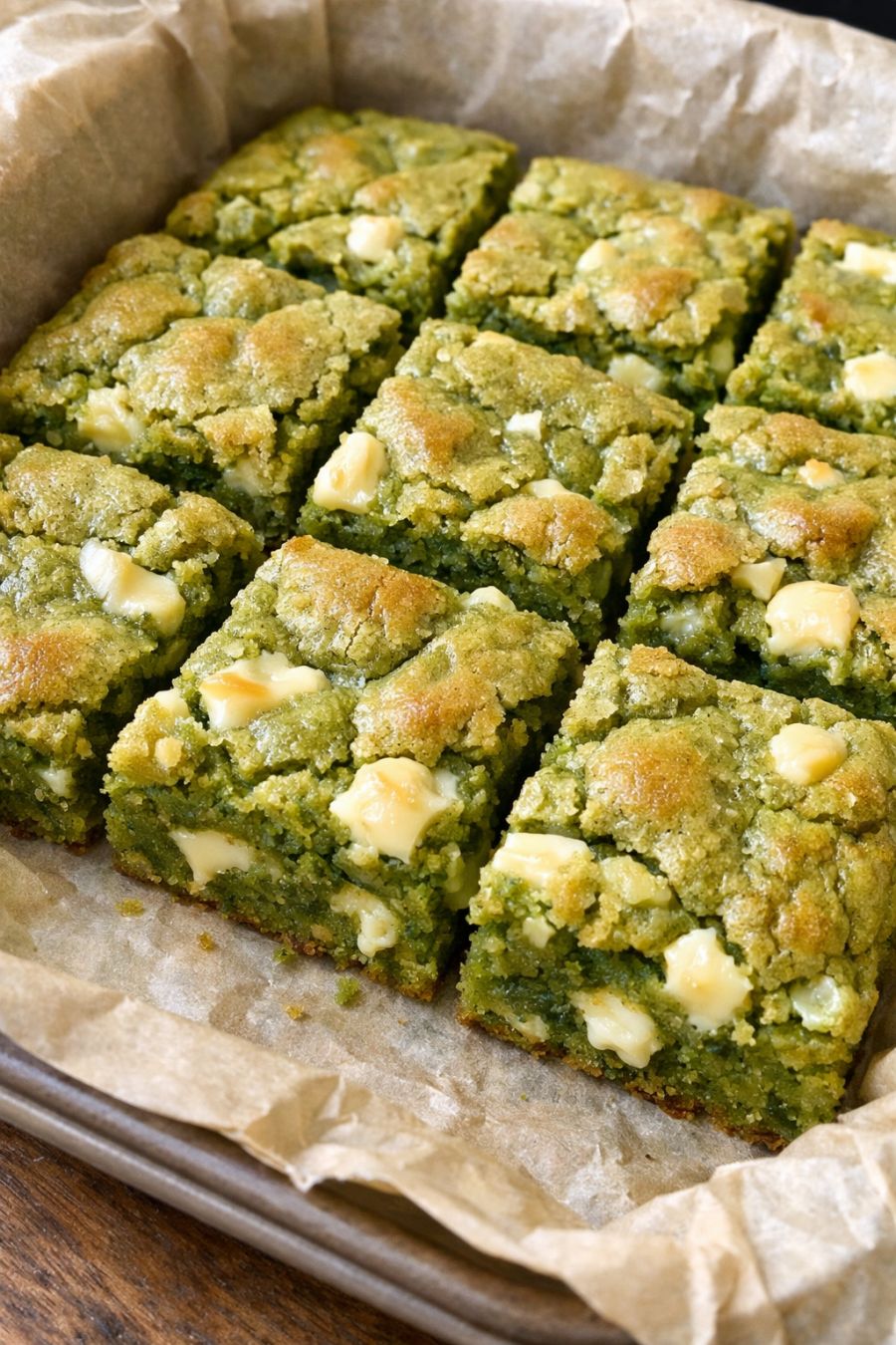 Let the blondies cool completely so they slice into neat, dense green squares with melty white chocolate pockets. We like them just slightly warm with a glass of cold milk for the kids and hot coffee or a matcha latte for the adults.