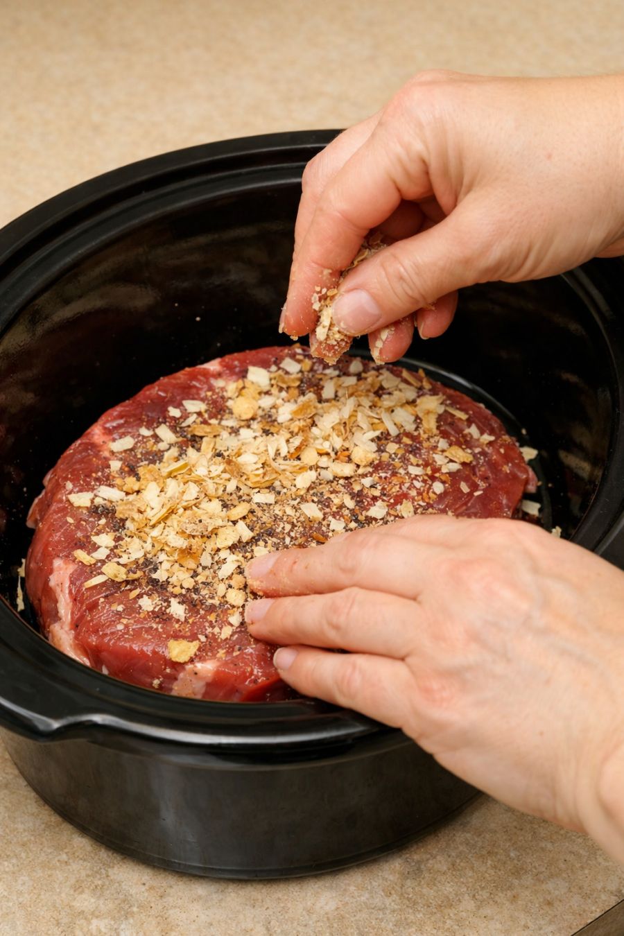 Pour beef broth over ground beef, together with 3 ingredients, into slow cooker for a comforting dinner that's my default when I don't know what to make