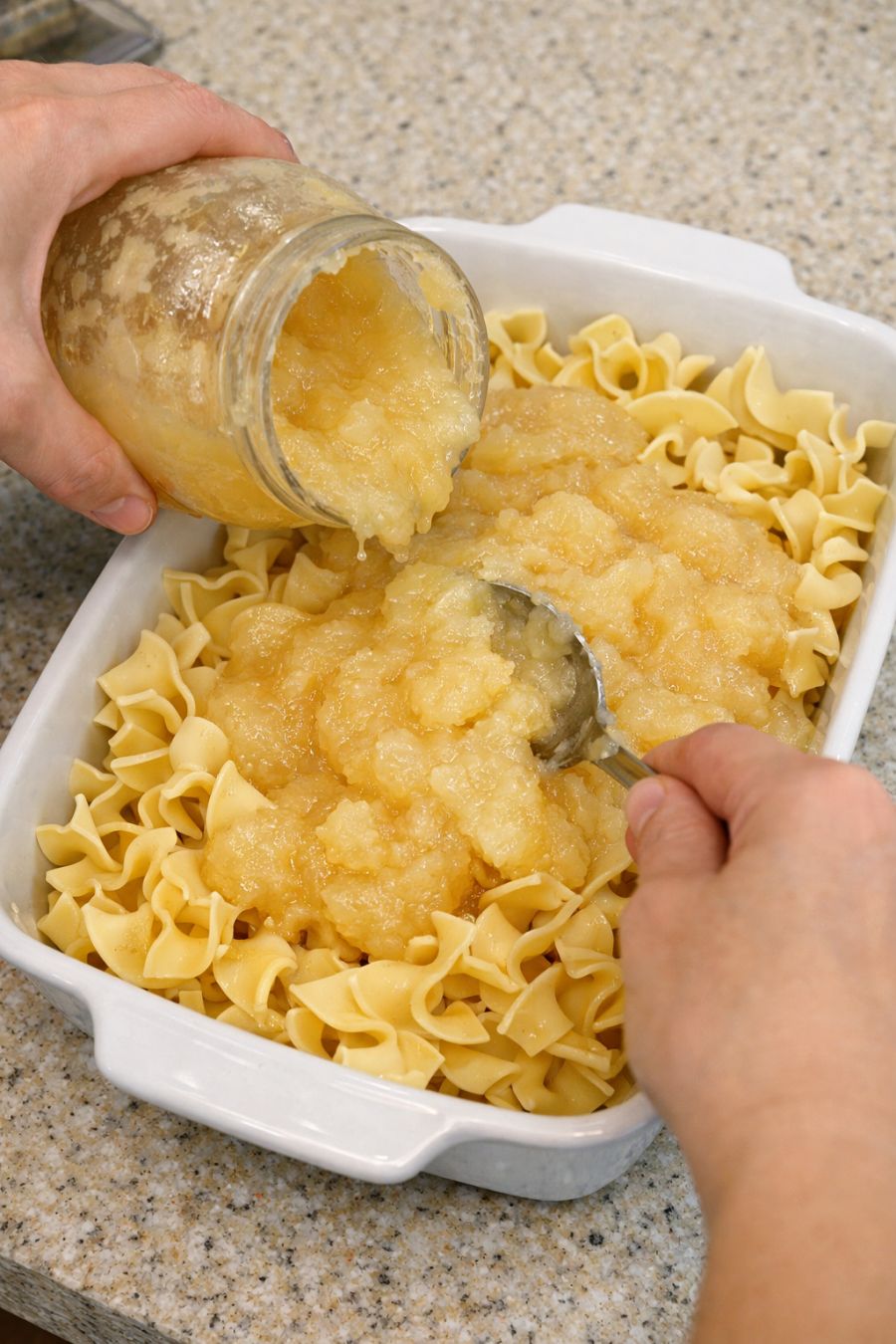 Mix jarred applesauce and these 2 ingredients over uncooked egg noodles into a casserole dish for a meal you'll crave over and over