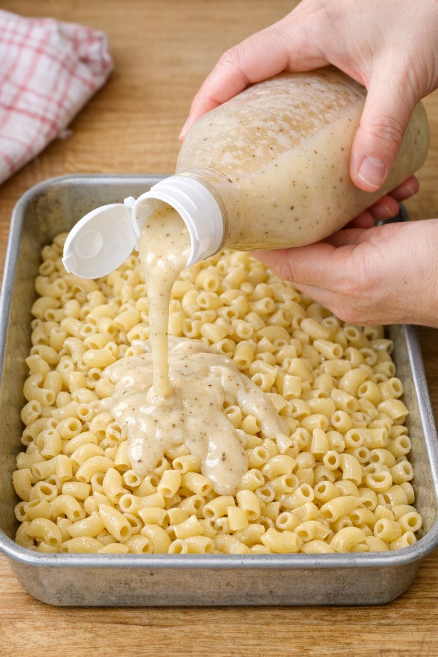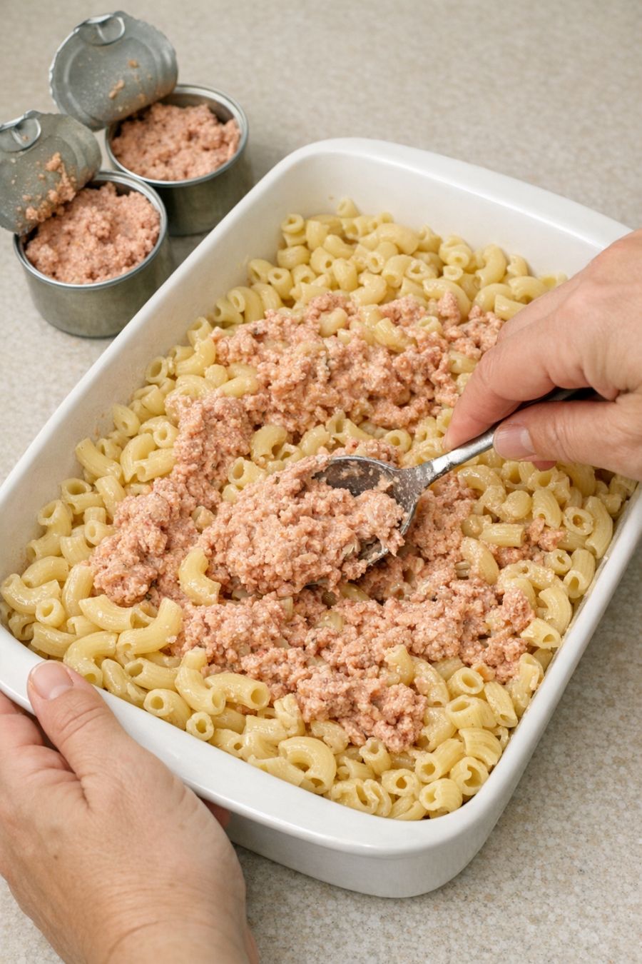 Mix canned deviled ham and these 2 ingredients over uncooked elbow macaroni into a baking dish for a comforting meal people always return to