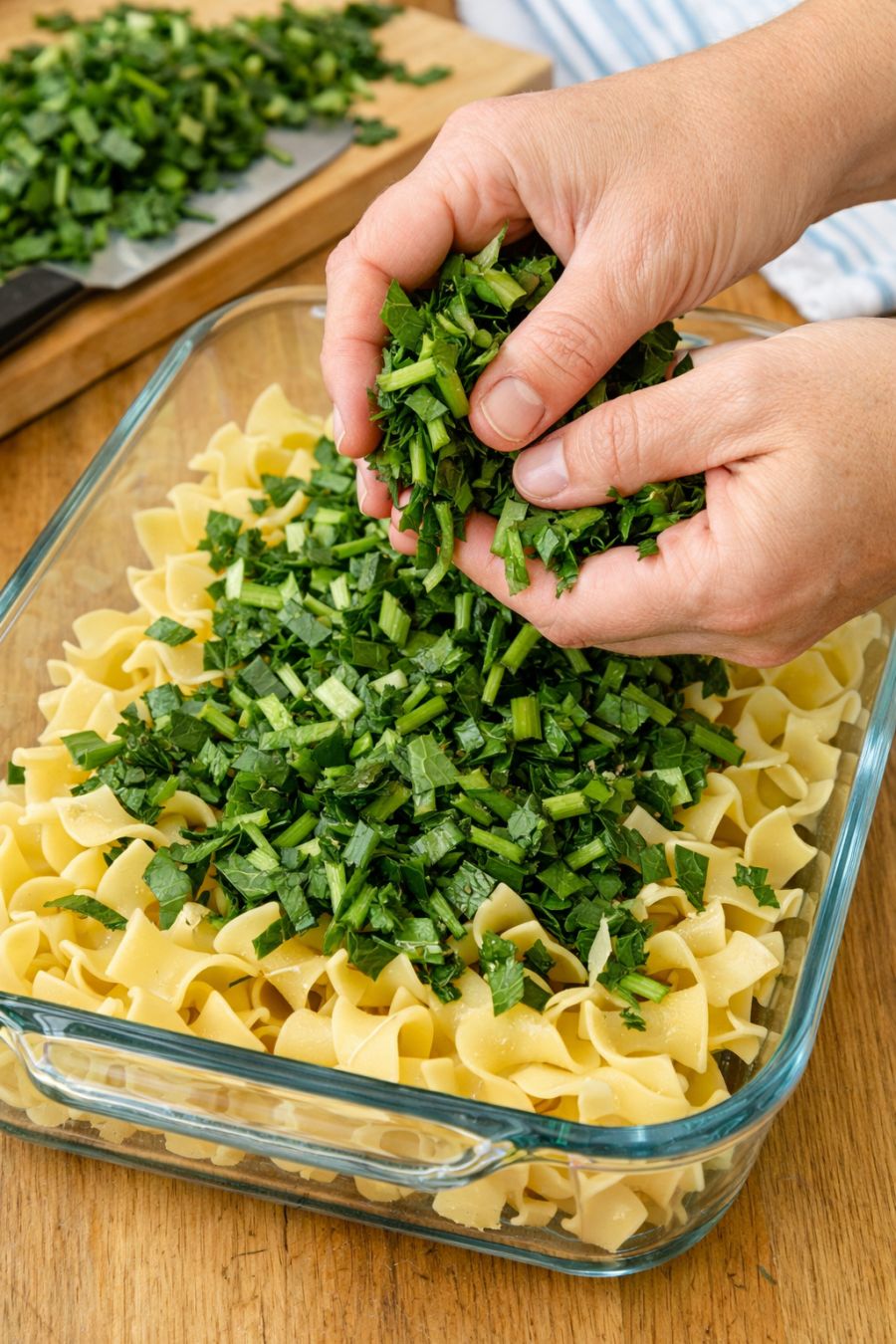 Drop chopped raw dandelion greens over dry wide egg noodles, together with 2 other ingredients, into a glass baking dish for a spring meal that's my default when I don't know what to make