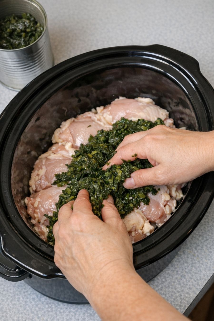 Spread canned spinach over raw chicken thighs, together with 2 ingredients, into slow cooker for a comforting meal that's always a yes in my house