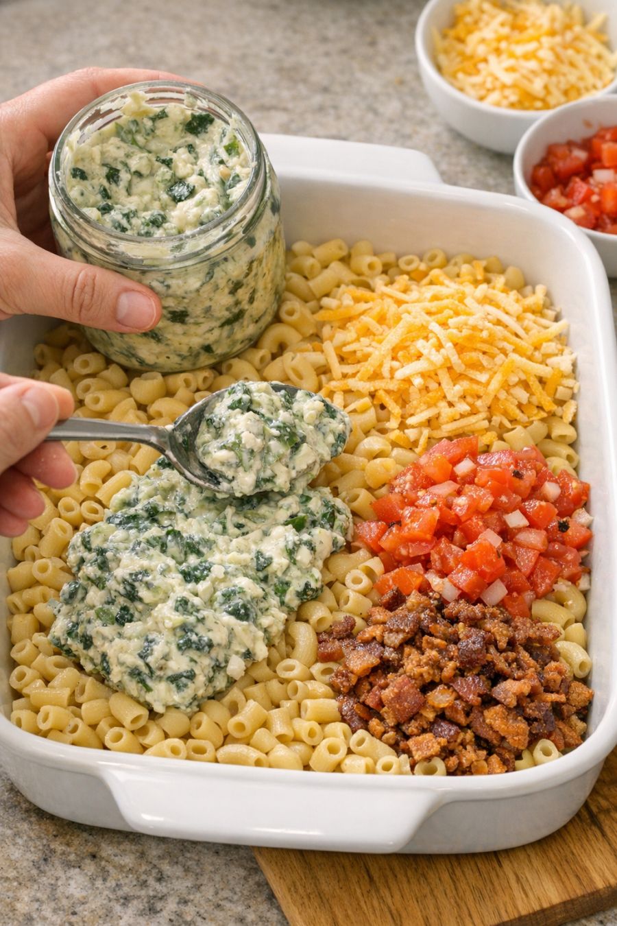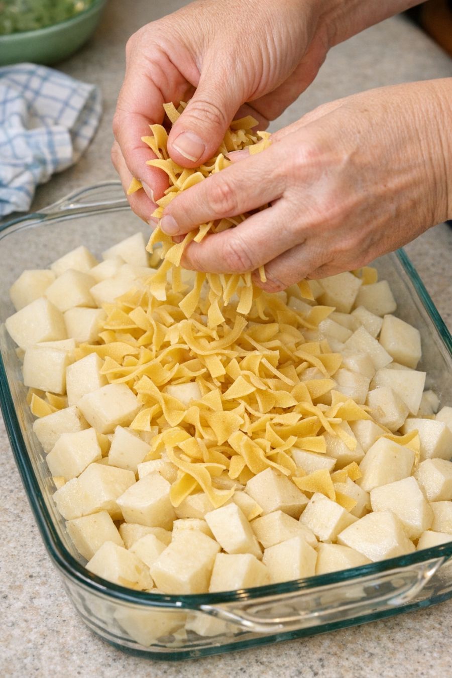 Scatter uncooked egg noodles over raw chunked white potatoes, together with 2 simple ingredients, into a glass casserole dish for a cozy family feast that's the one everyone asks for