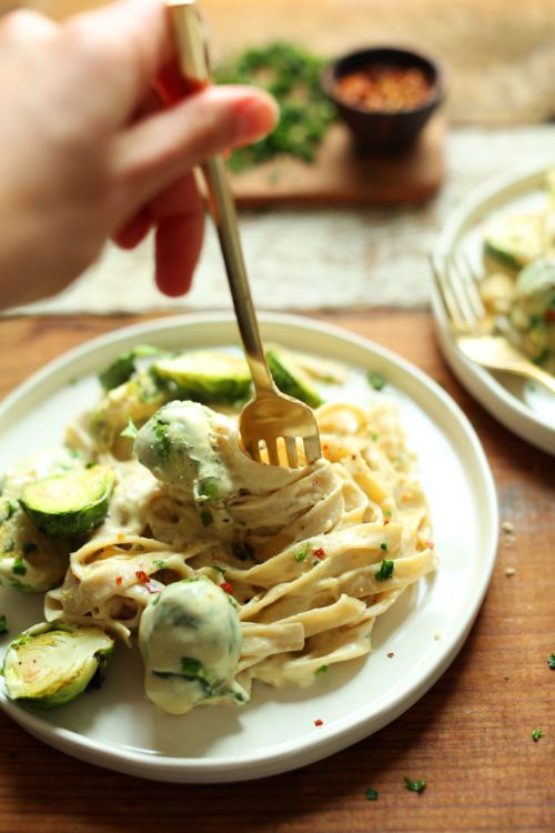 1. Vegan garlic Alfredo pasta with Brussel sprouts (h/t Minimalist Baker) You've never tried a cream sauce quite like this! The white wine and garlic come together to create the most tasty white sauce. The addition of Brussel sprouts makes it even more filling.