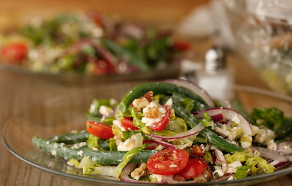 Green bean walnut and feta saladGarnished lightly cooked green beans with fresh mint sounds slightly unusual, but it's a totally delicious flavor combination. The video below uses that perfect pairing and adds all the elements of a crisp, fresh salad.