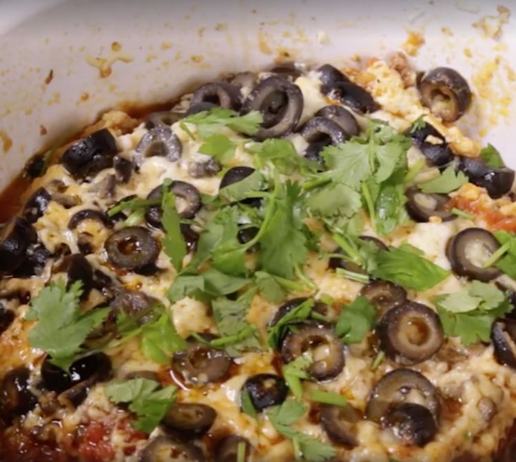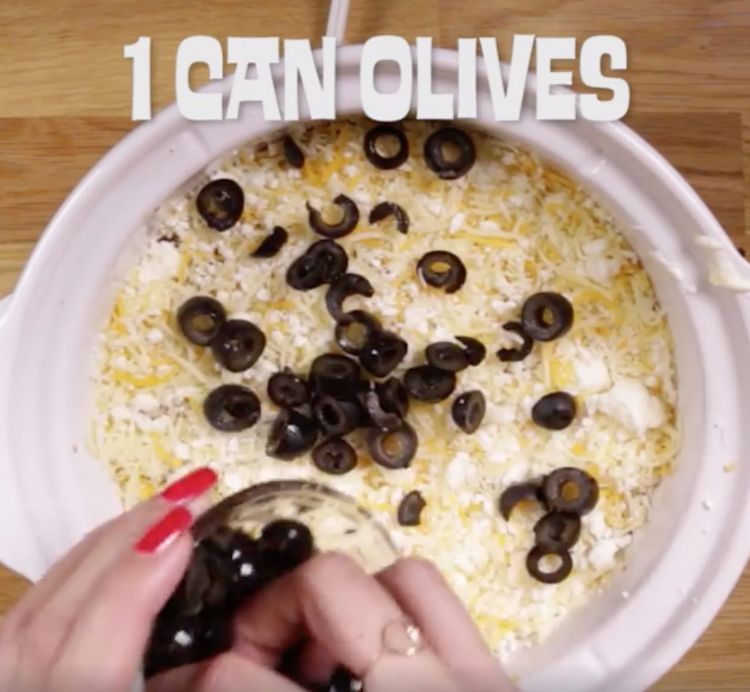 3. Line the base of your slow cooker with lasagne noodles then add the ricotta mixture, followed by the beef, half of the shredded cheese, and top with the two salsa sauces, then the remaining cheese, and finally the olives before cooking on high for 3 hours.