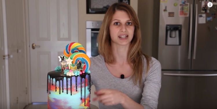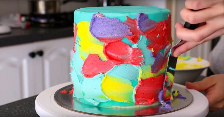 The following watercolor drip cake is a perfect example of the level of fun and creativity Rosie infuses into her delicious desserts. The talented baker begins by stacking three layers of cake on top of one another and coating the cake with frosting.
