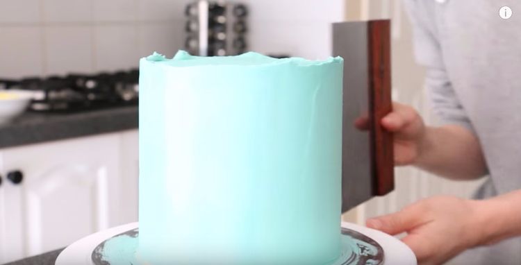 After freezing the frosting-coated cake for 10-15 minutes, Rosie proceeds to apply another layer of frosting in the color turquoise, thoroughly coating the cake so that the application looks seamless.