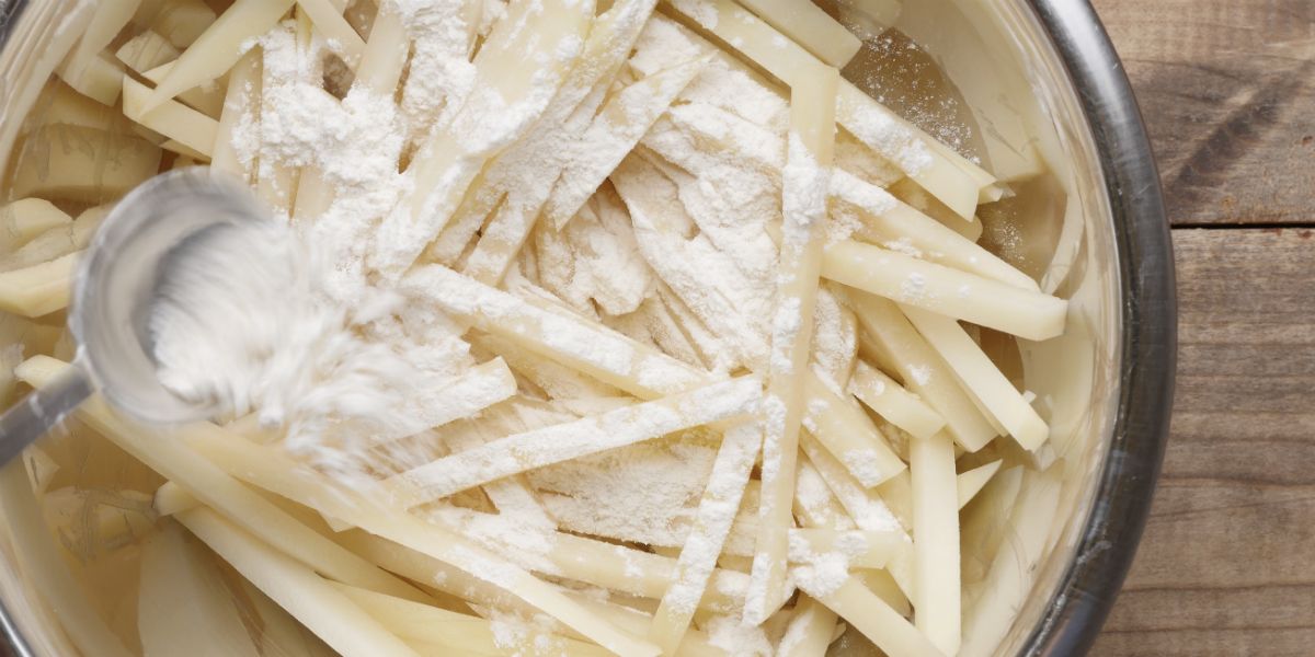 Crispy potatoes without oilWash and cut fresh potatoes into wedges (with or without the peel) and place them in cold water. Bring the water to a boil for five minutes. Drain the water, put the potatoes back in the pot, then add 1 tablespoon of flour. Add additional spices, such as garlic powder, onion powder and paprika. Cover and shake the pot vigorously for one minute. Set the oven to bake at 425 degrees. Place the potatoes on a baking sheet and bake for approximately 20 minutes.