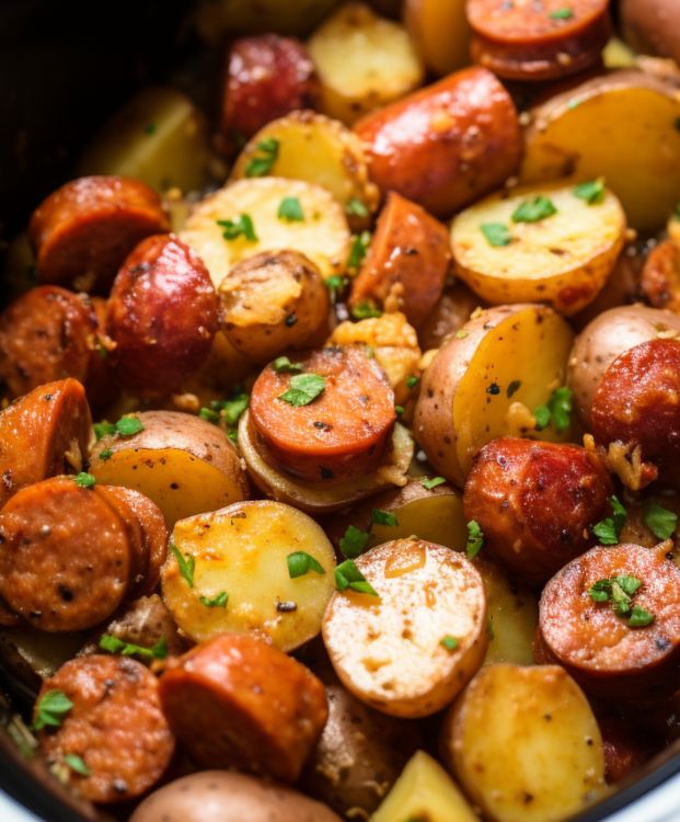 Serve the Slow Cooker Sausage & Potatoes hot, accompanied by a side of crusty bread or a crisp salad. This dish is perfect for a cozy family evening or for entertaining friends. It is sure to please even the pickiest eaters.