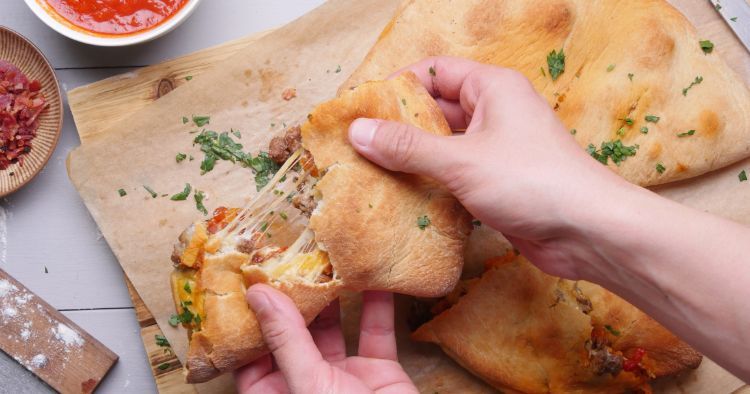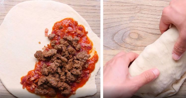 Cooktop Cove, all you need to do is place your cooked ground beef, bacon, melted cheese, and seasonings onto a flattened sheet of pre-made pizza dough. Preheat the oven to 500°F, then carefully roll the dough up — being sure to keep as much of the filling inside as possible — and bake for 20-25 minutes or until golden brown.