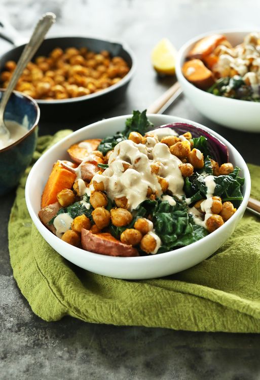 2. Sweet potato chickpea buddha bowl (h/t Minimalist Baker)These cute little bowls of goodness are so hearty and tasty that it's easy to forget how healthy they are! Crispy chickpeas, roasted sweet potato and a delicious maple and tahini sauce make this the perfect dish to hunker down with!