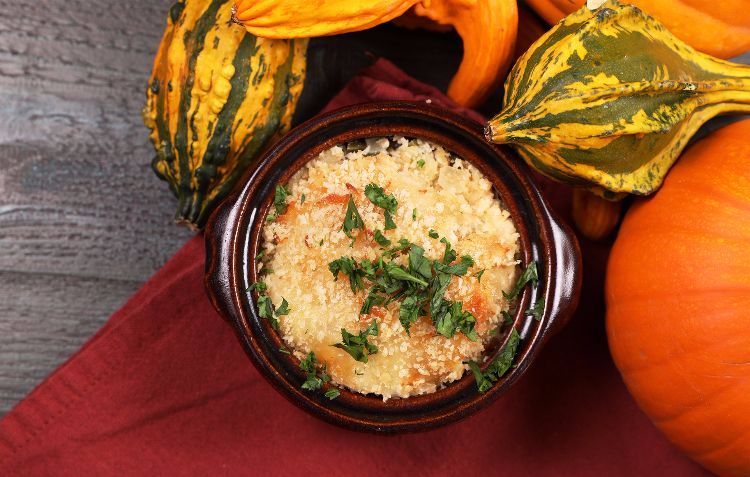 During cooking, you can add a few drops of water to loosen the fond on the bottom of the pan. Brown sugar will help a bit with the caramelization process. Next, you need to make a béchamel or, as it's called here, a white sauce. This creamy delicious sauce will help hold the casserole together. For this step, you will need a sauce pot. Combine everything in a casserole dish, top with breadcrumbs and cheese, and you are ready to bake.