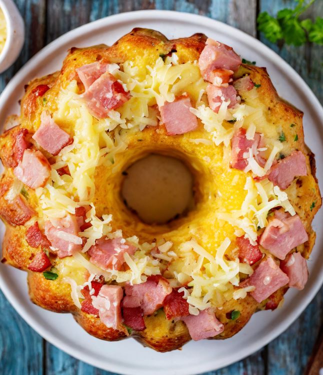 5. Pour the mixture into the greased bundt cake pan, evenly distributing the ingredients. Cover the pan with foil and let sit for a few minutes. Top with remaining shredded cheese. (We like to top with more ham on top.)