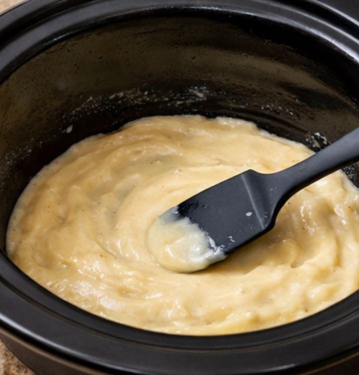 Spread 1 to 2 large spoonfuls of the gravy mixture over the bottom of the slow cooker to lightly coat it.
