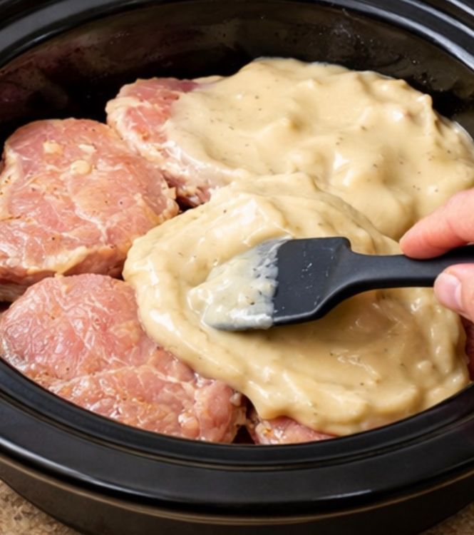 Arrange the pork chops in the slow cooker in an even layer. It’s fine if they overlap a bit, but try to keep them mostly in a single layer so they cook evenly and get fully bathed in the gravy.