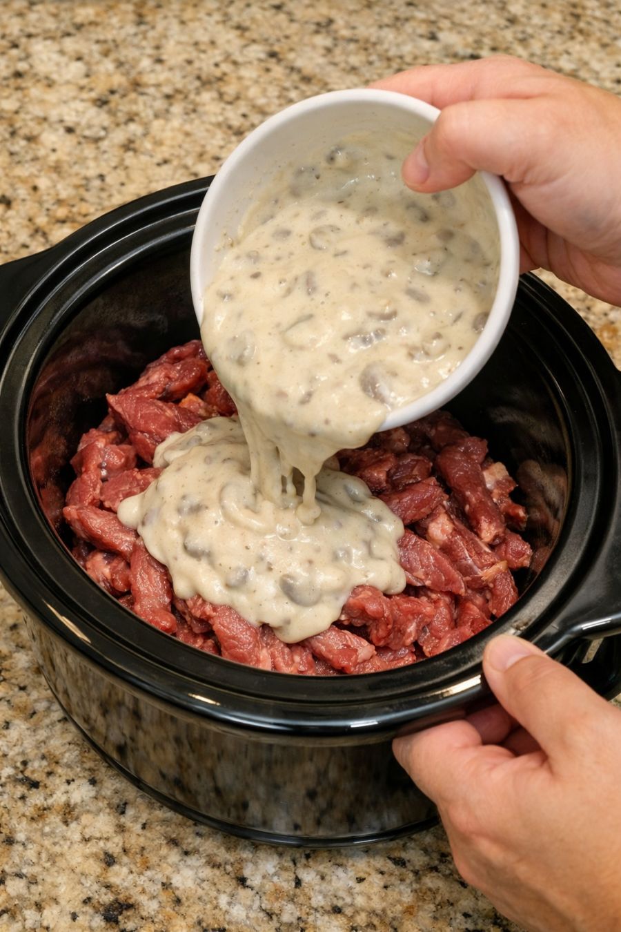 Pour cream of mushroom soup over beef strips, along with 3 other ingredients, into slow cooker for a hearty family dinner that’s my default when I don't know what to make