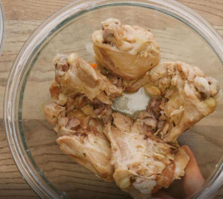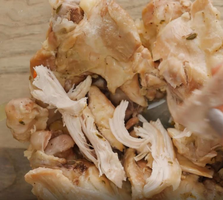 9. When the chicken is cool enough to handle, shred the meat and discard the bones.