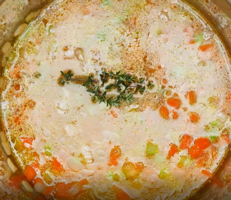 4. Turn off the sauté function by pressing cancel, and add the broth, thyme, bay leaf, salt, pepper and chicken.