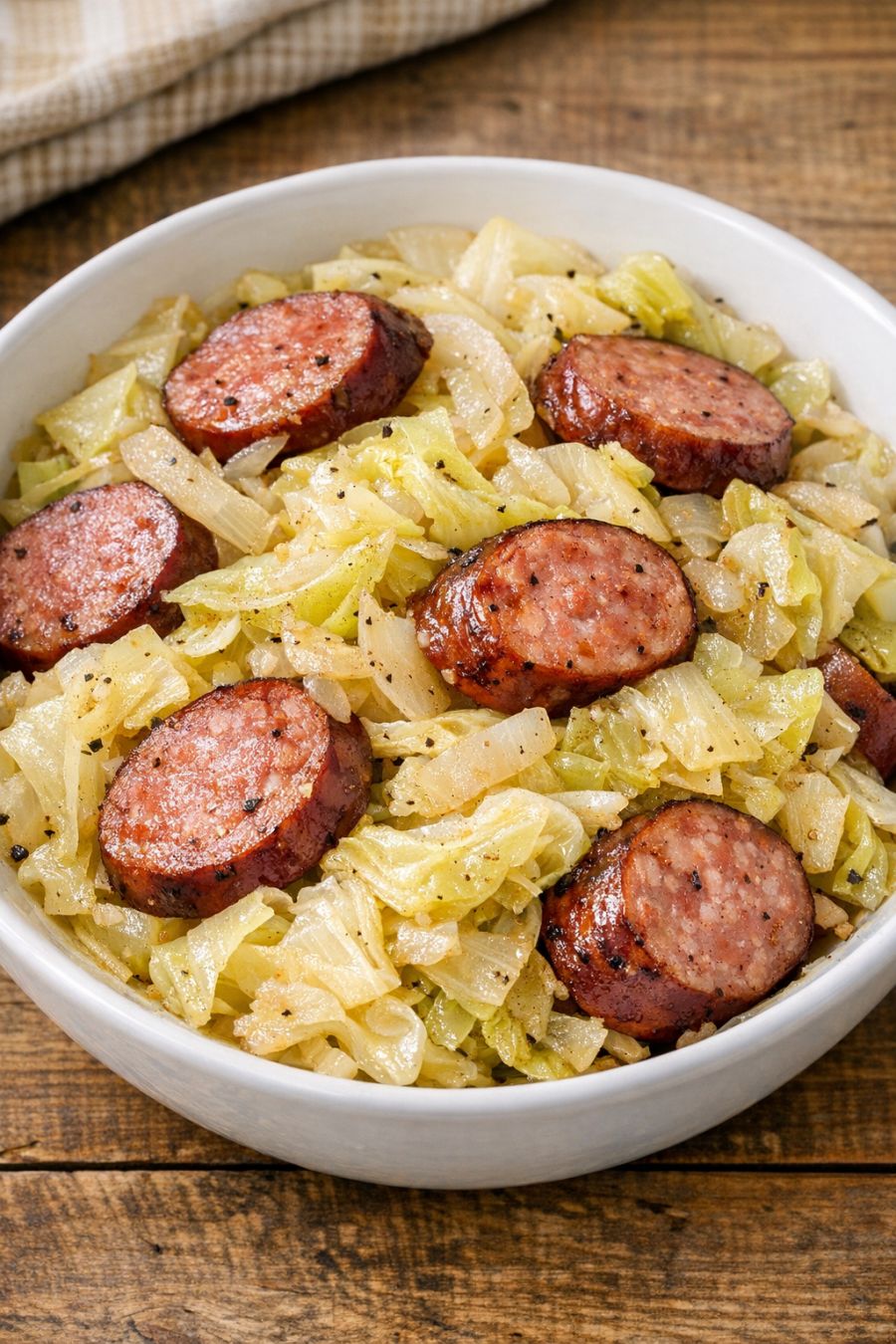 Serve this sausage and cabbage straight from the slow cooker into warm bowls, making sure to scoop from the bottom so everyone gets plenty of sausage and cabbage together. It’s especially good over a bed of mashed potatoes, buttered egg noodles, or simple boiled potatoes to soak up the flavorful juices. Add a side of crusty bread or dinner rolls, and, if you like a little brightness, a spoonful of grainy mustard or a splash of apple cider vinegar at the table. A crisp green salad or sliced apples on the side balances the richness nicely.