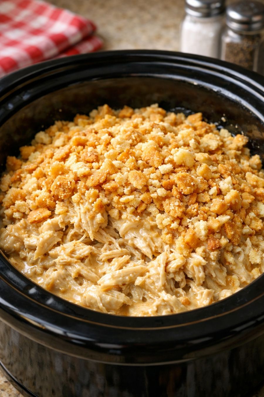 Sprinkle the crushed buttery crackers evenly over the top of the chicken and liquid. Do not stir; just let the crackers sit on top.