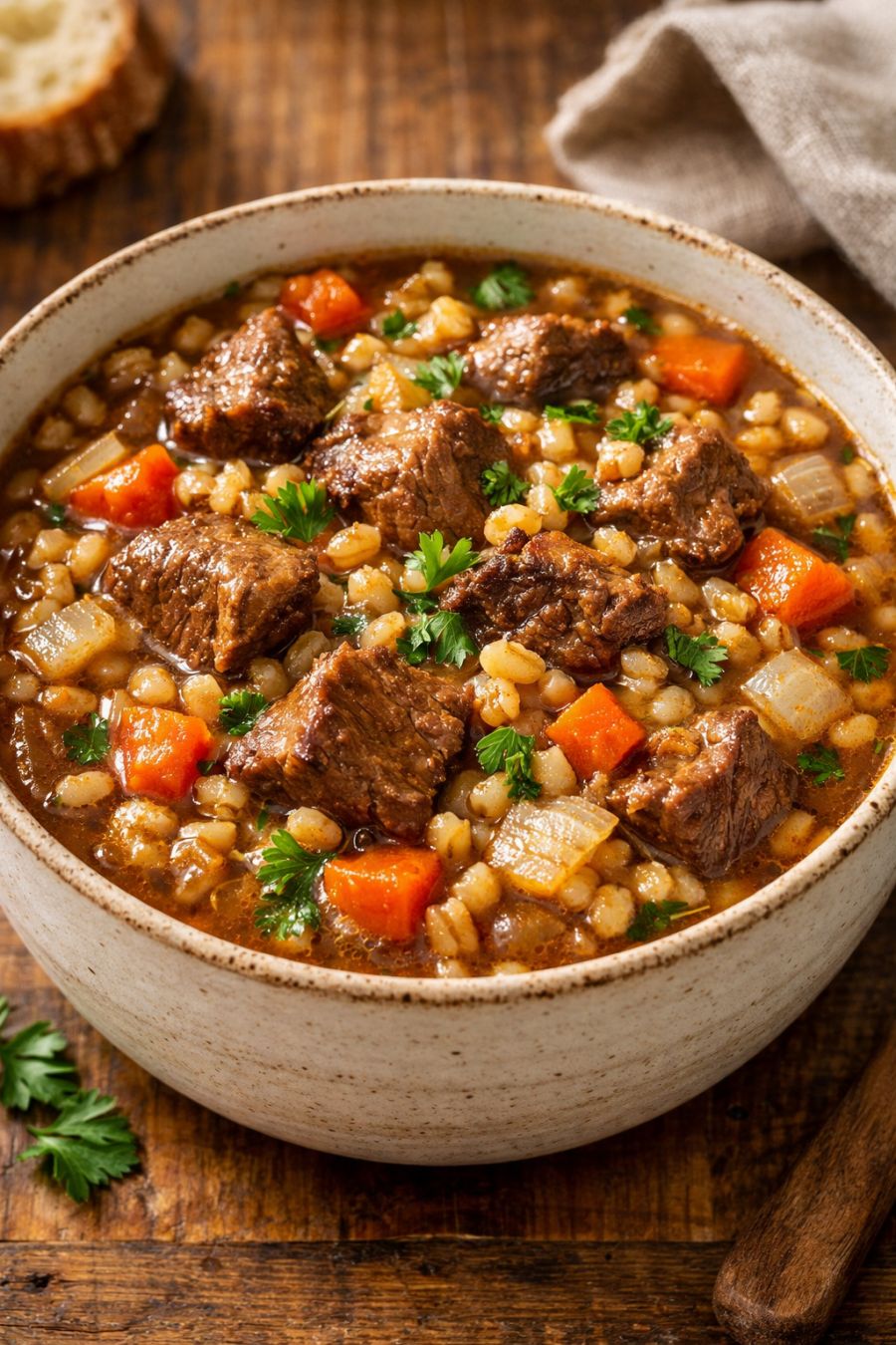Ladle the beef and barley into bowls and serve warm. Store any leftovers in an airtight container in the refrigerator for up to 3–4 days, adding a splash of broth or water when reheating if it thickens too much.