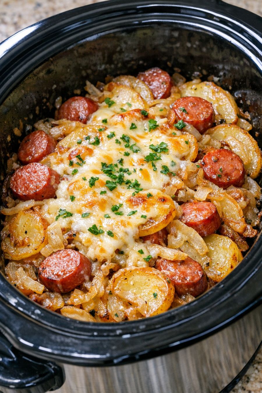 For a creamier, richer casserole, use condensed cream of chicken or cream of celery soup in place of cream of mushroom, or mix half of one with half of the other. If you like a little color and sweetness, tuck a handful of frozen peas or corn between the potato and hot dog layers during the last hour of cooking so they don’t get mushy. Cheddar lovers can sprinkle 1 to 1 1/2 cups of shredded cheese over the top during the final 15 minutes on HIGH, just until melted. To lean it a bit healthier while keeping the spirit of the dish, use turkey or chicken hot dogs and add an extra onion or a few thinly sliced carrots to the layers. For more seasoning, a pinch of garlic powder or paprika over each potato layer is nice, but don’t overcomplicate it—this recipe shines because it’s simple and forgiving. Leftovers reheat well in a skillet with a splash of milk or water; many folks say it tastes even better the next day.