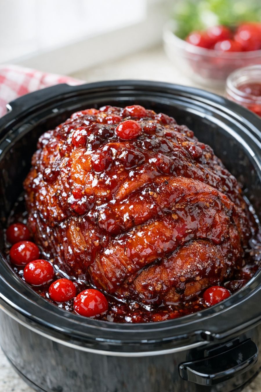 Cover the slow cooker with the lid and cook on LOW for 5–7 hours, or on HIGH for 3–4 hours, until the ham is heated through and very tender. The cherry mixture will thin out into a sauce as it cooks.