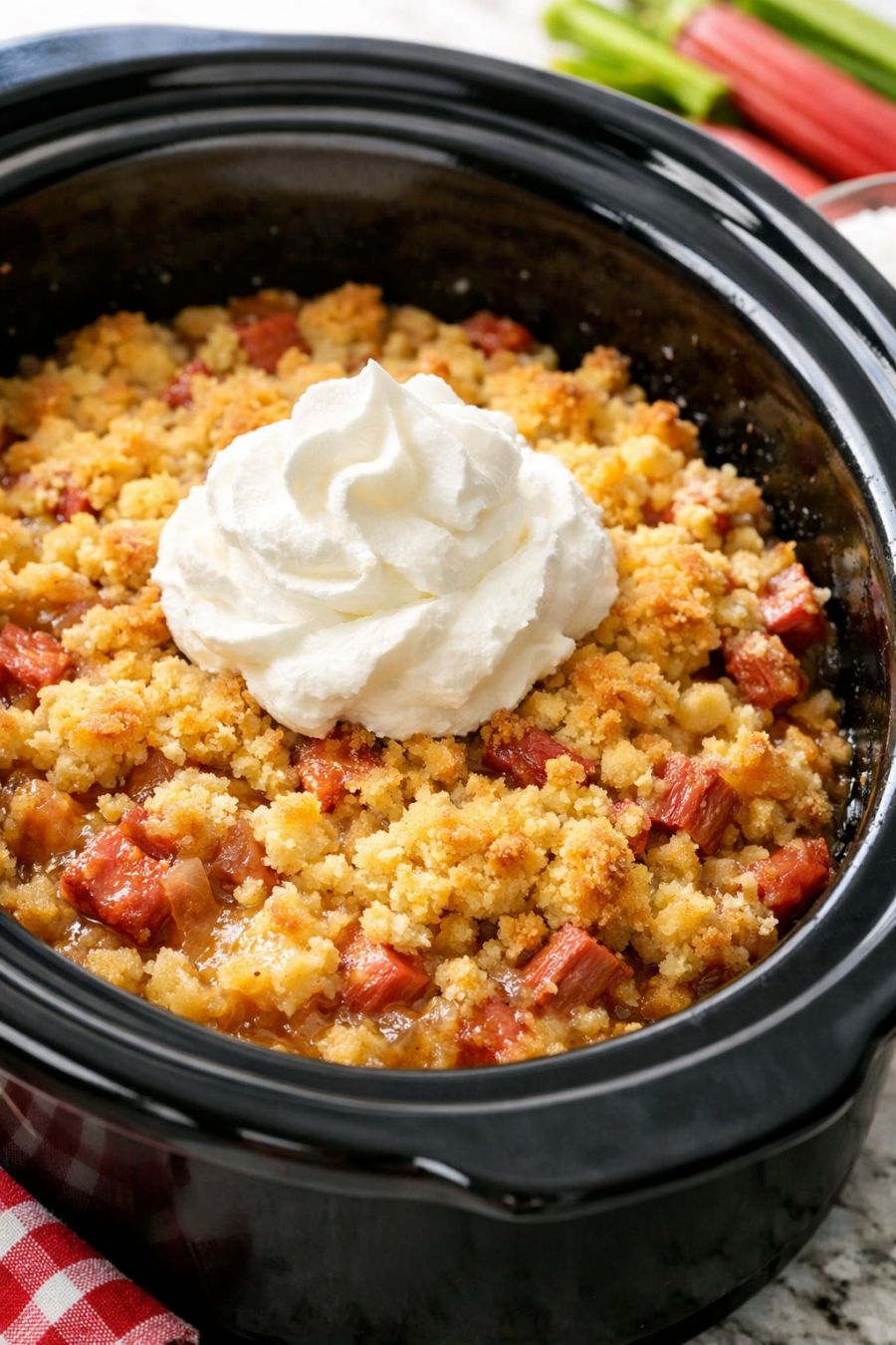 Turn off the slow cooker and let the dump cake rest, uncovered, for about 15 minutes to thicken slightly. The texture will be soft and spoonable, with pockets of tender cake and saucy rhubarb underneath.