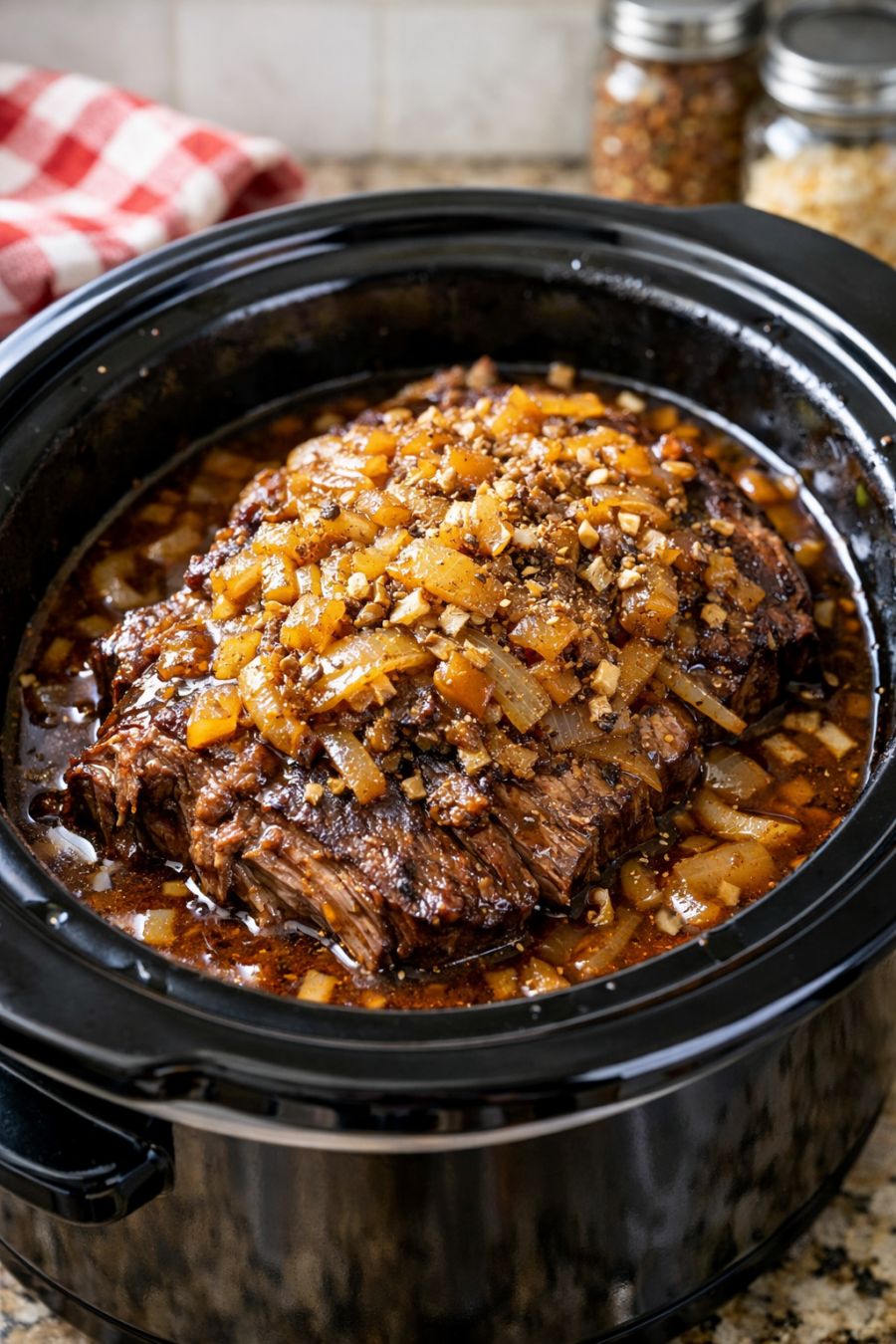 If you like a richer gravy, whisk 1 to 2 tablespoons of cornstarch with a few tablespoons of cold water and stir it into the slow cooker juices during the last 30 minutes of cooking on HIGH, or simmer the strained juices on the stove until thickened. For a slightly sweeter, more Amish-style pot roast feel, add 1 to 2 tablespoons of brown sugar before cooking. You can also tuck in 1 to 2 pounds of baby potatoes and a few peeled carrots around the roast before pouring on the French onion soup for a full one-pot meal. To make it more sandwich-friendly, shred the beef, pile it onto toasted hoagie rolls, top with Swiss or provolone, and broil until the cheese melts. Leftovers keep well in the fridge for up to 4 days and freeze nicely; I like to portion the beef and juices into containers for easy future dinners.