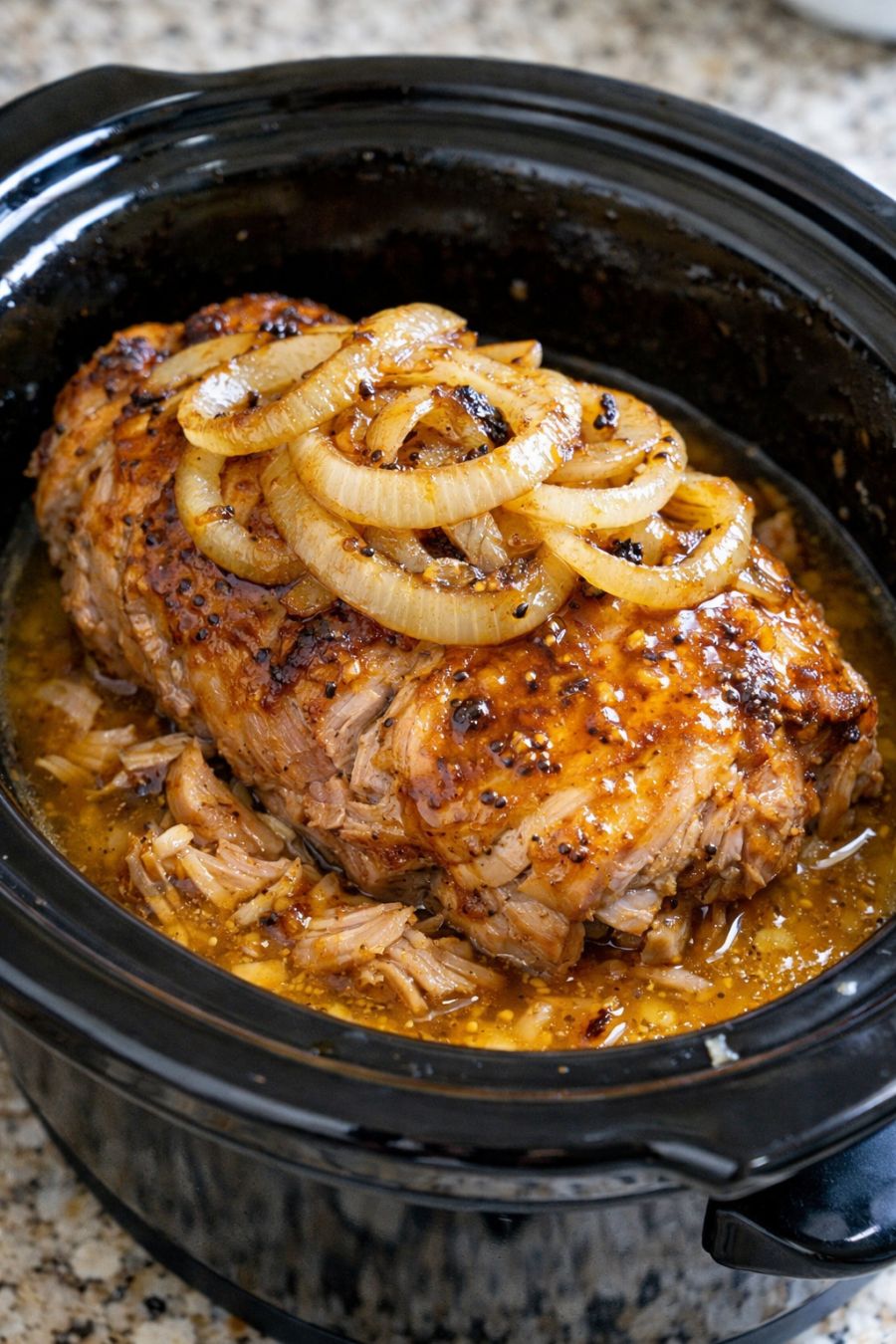 Place the slow cooker insert on your countertop or remove the lid if it’s already in the base. Scatter the sliced onion evenly over the bottom of the slow cooker to make a bed for the pork.
