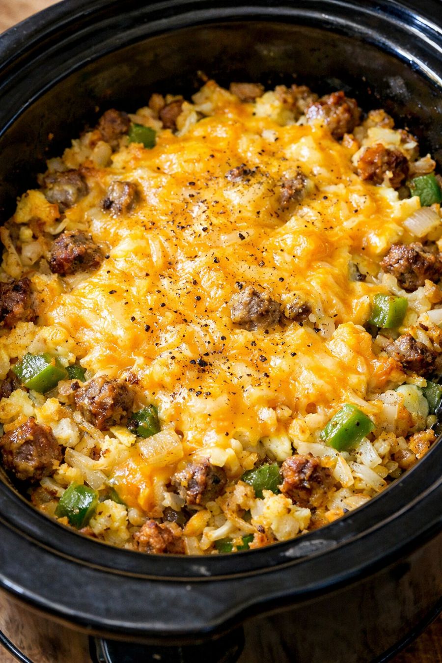 Slowly pour the beaten egg mixture evenly over the frozen hash browns, sausage, and cheese in the slow cooker, making sure to cover as much of the surface as possible. This is the key step that brings everything together into a casserole.
