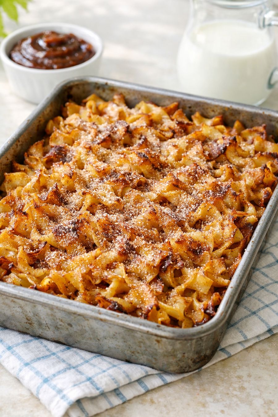 Serve these sweet apple noodles warm, straight from the roasting pan, with a simple green side like buttered peas or steamed green beans to balance the sweetness. They’re lovely alongside roasted pork, baked ham, or a skillet of sausage patties, since the apple flavor plays so nicely with savory meats. For a lighter touch, pair a small scoop with a crisp cabbage or apple slaw. If you’d rather lean into dessert, spoon the noodles into small bowls, top with a dollop of whipped cream or vanilla yogurt, and add a sprinkle of chopped nuts for a cozy, pudding-like treat.