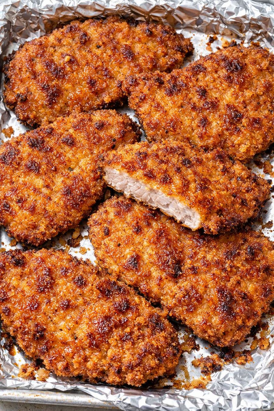 Press each oiled cutlet into the breadcrumb-Parmesan mixture, coating both sides and pressing firmly so the crumbs adhere well. Shake off any loose crumbs and lay the breaded cutlets in a single layer on the prepared foil-lined baking sheet. Leave a bit of space between each piece so the edges can crisp.