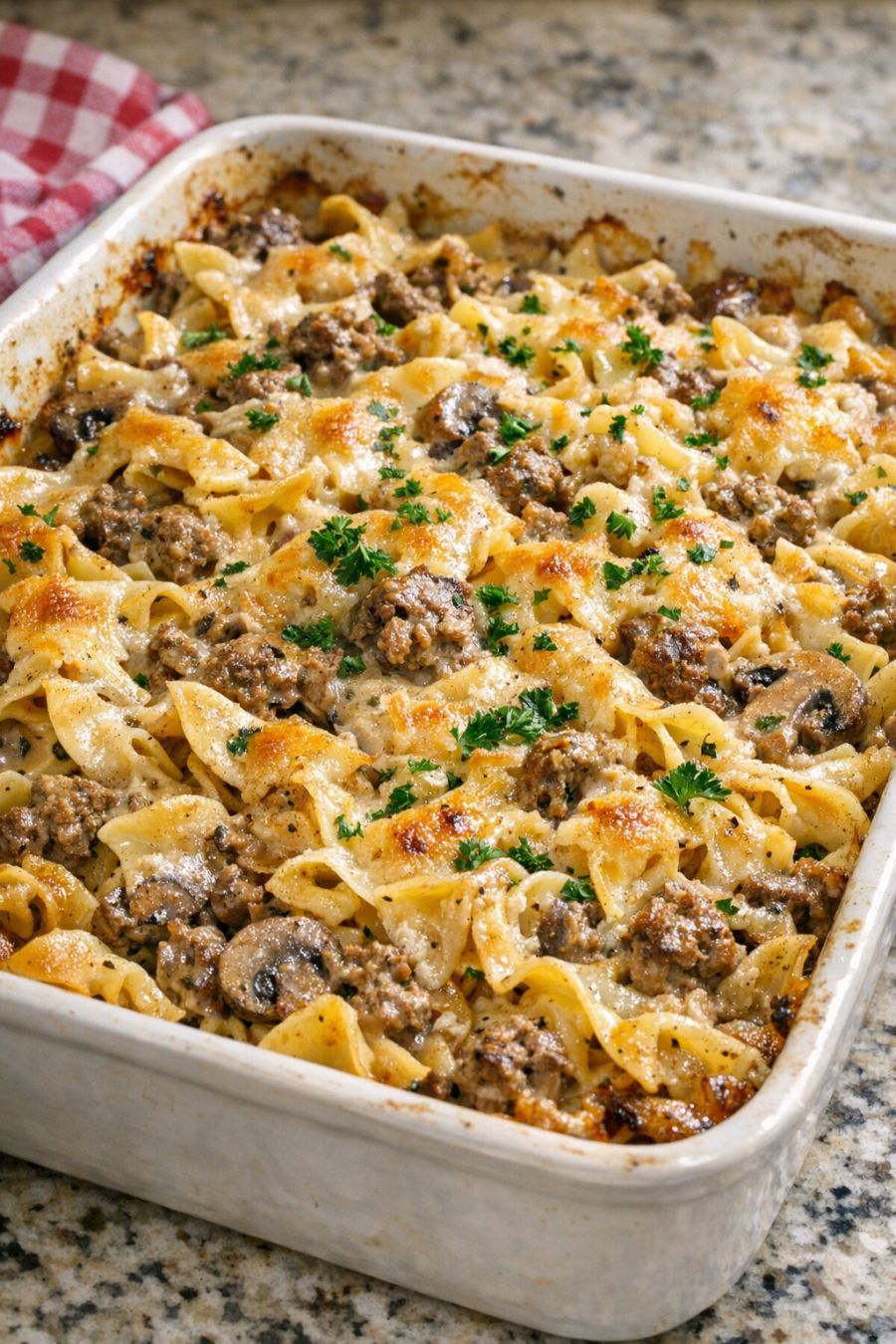 Once the noodles are tender and the casserole is bubbling, remove it from the oven and let it rest, uncovered, for about 5 minutes. This helps the sauce thicken slightly and makes it easier to serve.