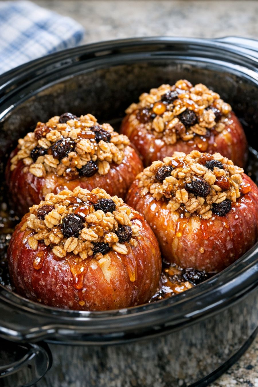 Serve the apples warm, spooning some of the oat mixture and juices from the bottom of the slow cooker over each one.