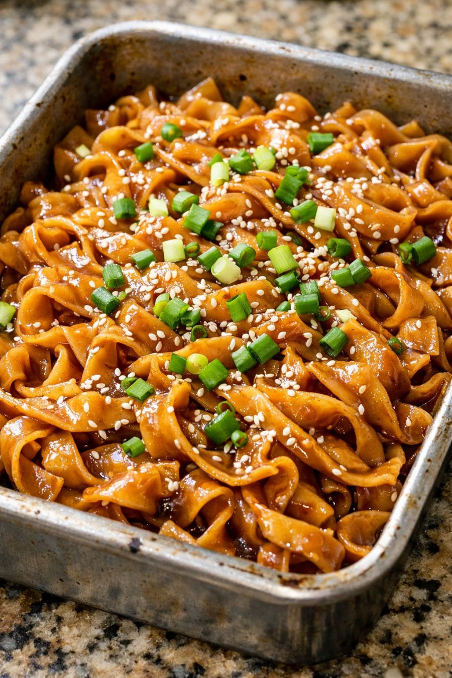 Let the noodles rest for 5–10 minutes before serving. This short rest helps the sauce thicken slightly and makes it easier to scoop neat portions. Taste and add a pinch of salt if needed, then serve warm straight from the roasting pan.