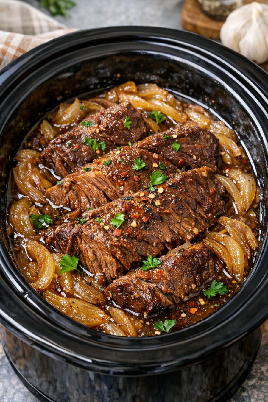 For a slightly sweeter, more potluck-style flavor, add 1 to 2 tablespoons of brown sugar to the condensed beef broth and Worcestershire mixture before pouring it over the roast. If you like a subtle tang, add 1 tablespoon of apple cider vinegar or yellow mustard, which plays nicely with the rich beef. You can also add root vegetables—such as 4 to 5 peeled carrots cut into chunks and 3 to 4 quartered potatoes—around the roast at the beginning of cooking for a one-pot meal; just be sure your slow cooker isn’t filled past about two-thirds full. For a more herbaceous version, tuck in a bay leaf and a sprig or two of fresh thyme or rosemary, removing them before serving. To turn the cooking juices into a thicker gravy, transfer 2 cups of the hot liquid to a saucepan, whisk in a slurry of 2 tablespoons cornstarch and 2 tablespoons cold water, and simmer for a few minutes until glossy and thickened, then pour over the beef at the table. Leftovers freeze well; cool completely, store in their juices in a freezer-safe container, and freeze for up to 3 months for an easy future meal.