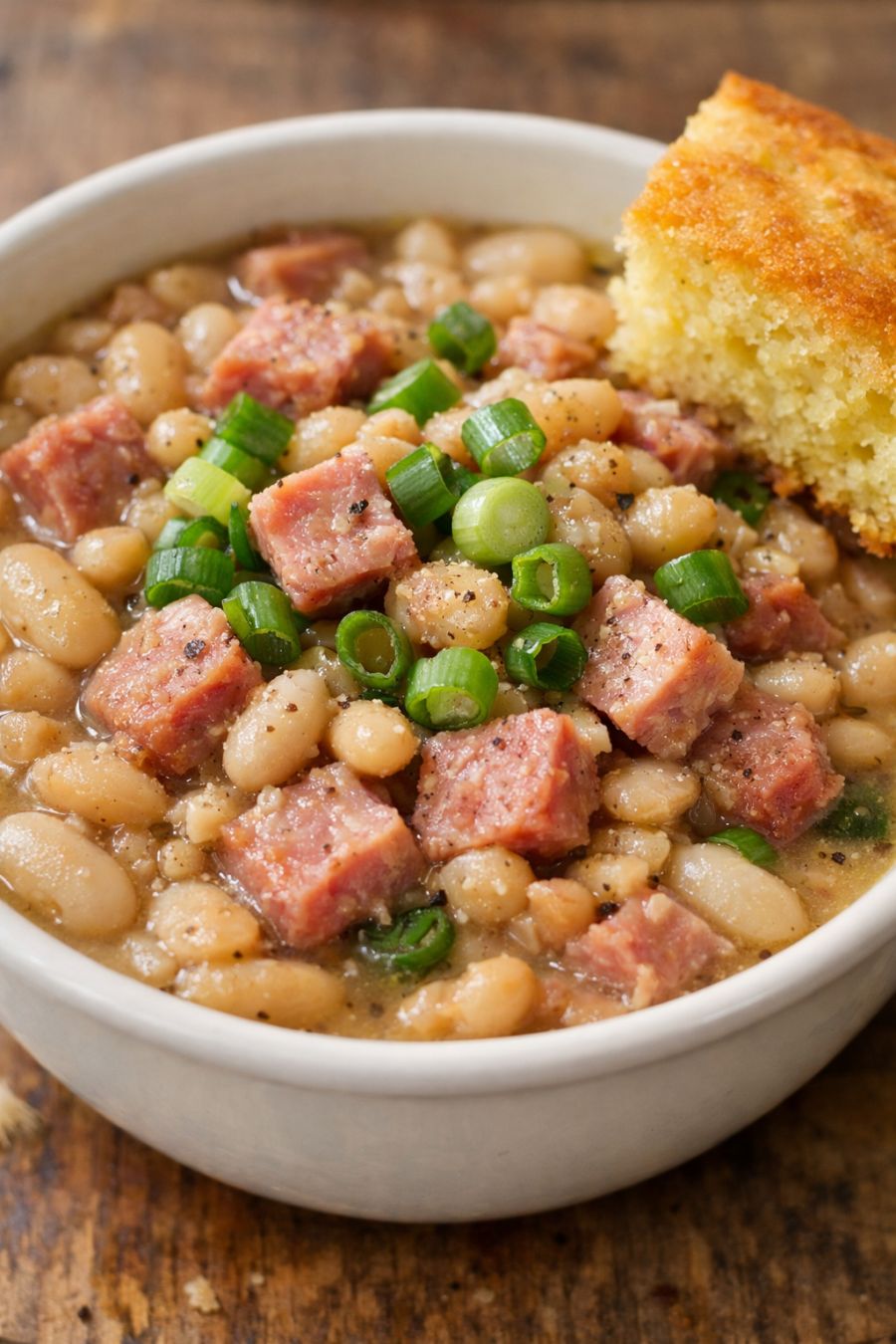 Serve these ham and beans in warm bowls with a side of cornbread, biscuits, or buttered dinner rolls for soaking up the broth. A simple green salad or steamed green beans adds a nice bit of freshness alongside the hearty beans. If your family likes a little extra comfort, put out shredded cheddar, hot sauce, and sliced green onions so everyone can top their own bowl just the way they like it.