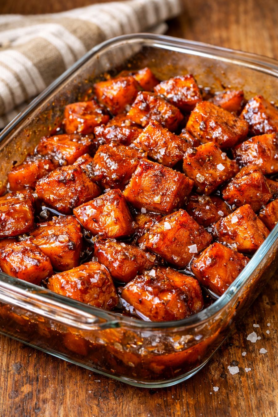 Taste and adjust the seasoning if needed, adding a pinch more salt if you like. Let the sweet potatoes rest for 5 minutes so the hot glaze thickens slightly, then serve warm straight from the glass baking dish.