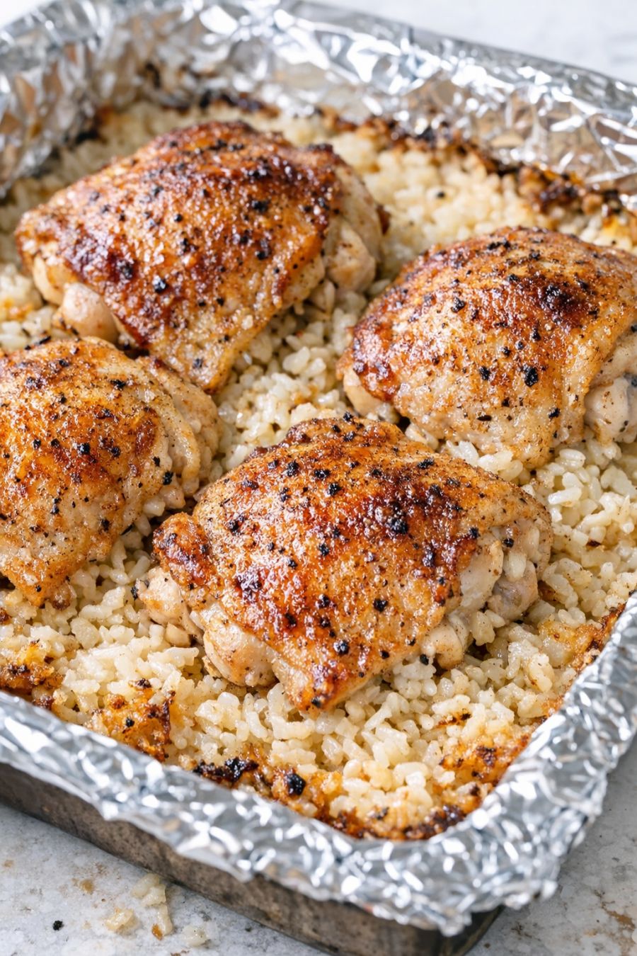 Carefully remove the foil (watch for steam) and return the pan to the oven, uncovered. Bake for another 25 to 35 minutes, or until the chicken skin is golden brown, the rice is creamy with lightly crispy edges, and the chicken reaches an internal temperature of at least 165°F (74°C).