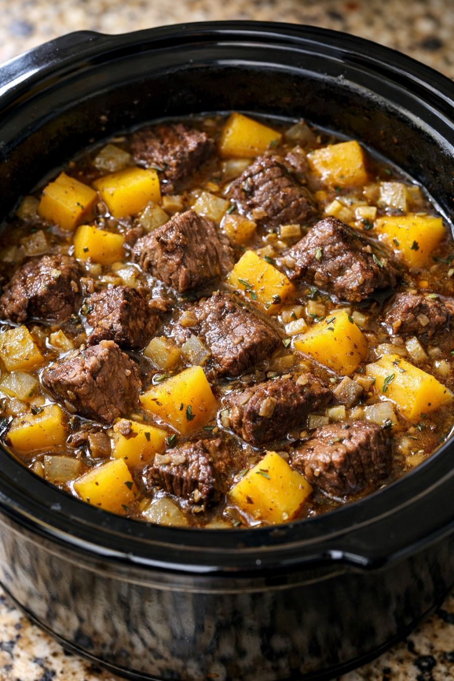 If your slow cooker tends to run dry or you prefer a bit more broth, you can splash in 1/2 cup of water or beef broth before cooking without changing the spirit of the dish. For a slightly richer flavor, add a tablespoon of butter dotted over the beef before you layer on the rutabagas. A teaspoon of dried thyme or a bay leaf tucked in with the onions gives a gentle herbal note that still feels very traditional. You can also swap part of the rutabaga for diced carrots or potatoes if that’s what you have on hand, keeping the total amount of vegetables about the same. Leftovers reheat beautifully on the stovetop with a small splash of water, and they’re wonderful spooned into a baking dish, topped with mashed potatoes, and baked into a simple cottage-style pie the next day.