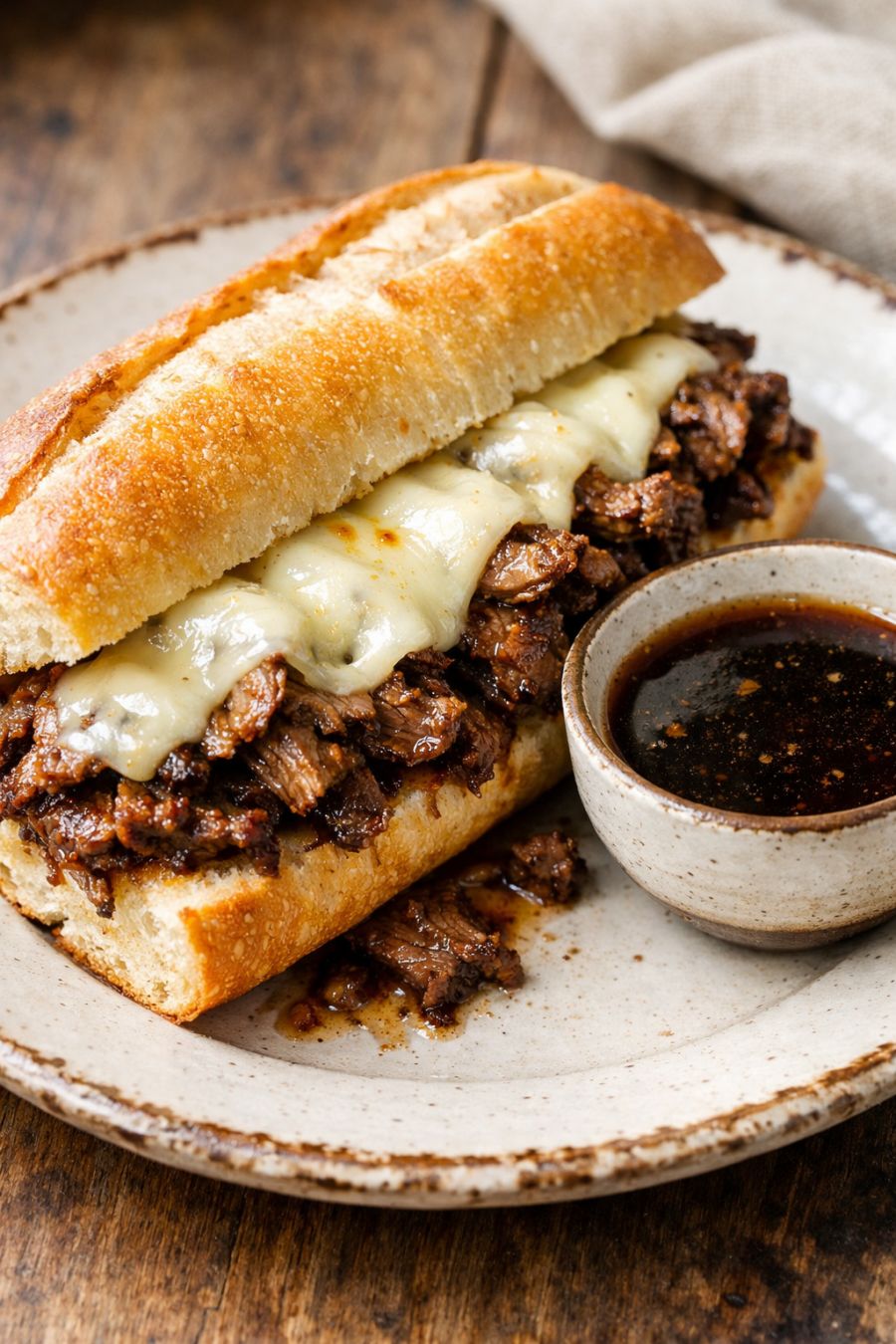 Serve the shredded beef on toasted hoagie rolls or sturdy sandwich buns, with a small bowl of the cooking liquid on the side for dipping. A slice of provolone or Swiss melted over the meat under the broiler turns this into a classic, gooey French dip. On the side, think crisp, fresh contrasts: a simple green salad with a sharp vinaigrette, roasted green beans, or even coleslaw. Leftovers are wonderful tucked into tortillas, spooned over mashed potatoes, or served open-faced on crusty bread with a ladle of the jus over the top.
