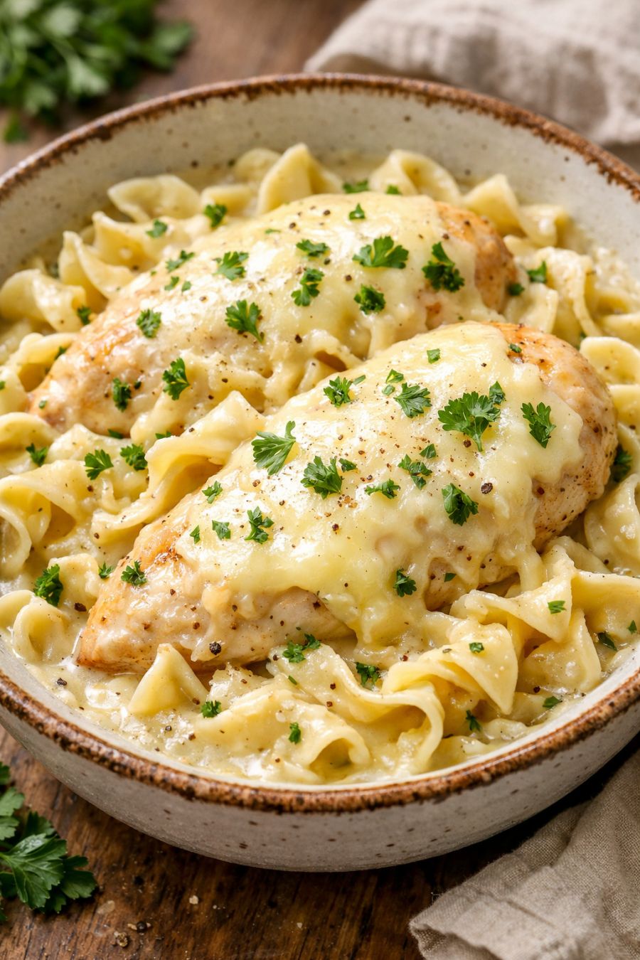 Serve the Swiss chicken and noodles in wide bowls, topped with a little extra black pepper and a sprinkle of chopped fresh parsley if you have it. A crisp green salad with a tangy vinaigrette or simple steamed green beans helps balance the richness. Warm dinner rolls or crusty bread are great for catching any extra sauce in the bottom of the bowl. For a fuller spread, add a side of roasted carrots or a basic cucumber salad to keep things bright and refreshing.