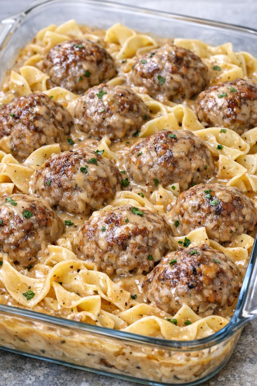For a slightly different flavor while still keeping the spirit of the recipe, you can swap one can of cream of mushroom soup for cream of chicken or cream of celery, which is common in many Amish and Mennonite kitchens. If you prefer a lighter gravy, use low-sodium broth and a reduced-sodium soup. To lean more into the farmhouse style, choose beef or pork meatballs that are labeled “homestyle” rather than Italian, so you avoid competing herbs and spices. If you’d rather not serve over noodles, the meatballs and gravy are also excellent over mashed potatoes or buttered rice. For a make-ahead version, assemble the meatballs and sauce in the dish, cover tightly, and refrigerate up to 24 hours before baking; add about 10 minutes to the covered bake time if starting from cold. Leftovers reheat well in a covered dish at 325°F, or gently on the stovetop with a splash of extra broth to loosen the gravy.