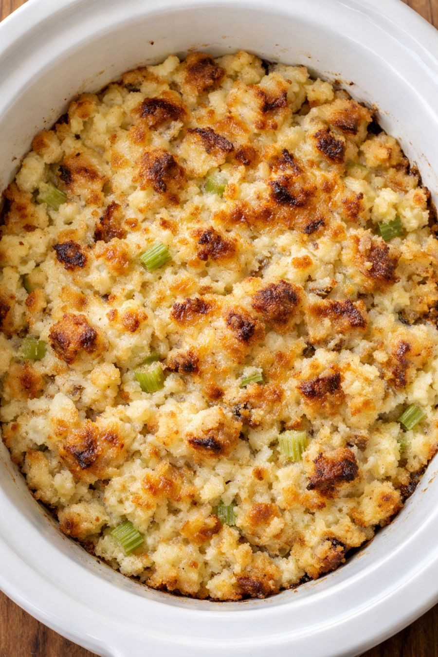 Taste and add a pinch more salt if needed. Spoon the potato filling directly from the slow cooker to the table, serving it hot as you would mashed potatoes or stuffing. The top should look golden and textured, with creamy potatoes and visible toasted bread cubes and celery flecks throughout.
