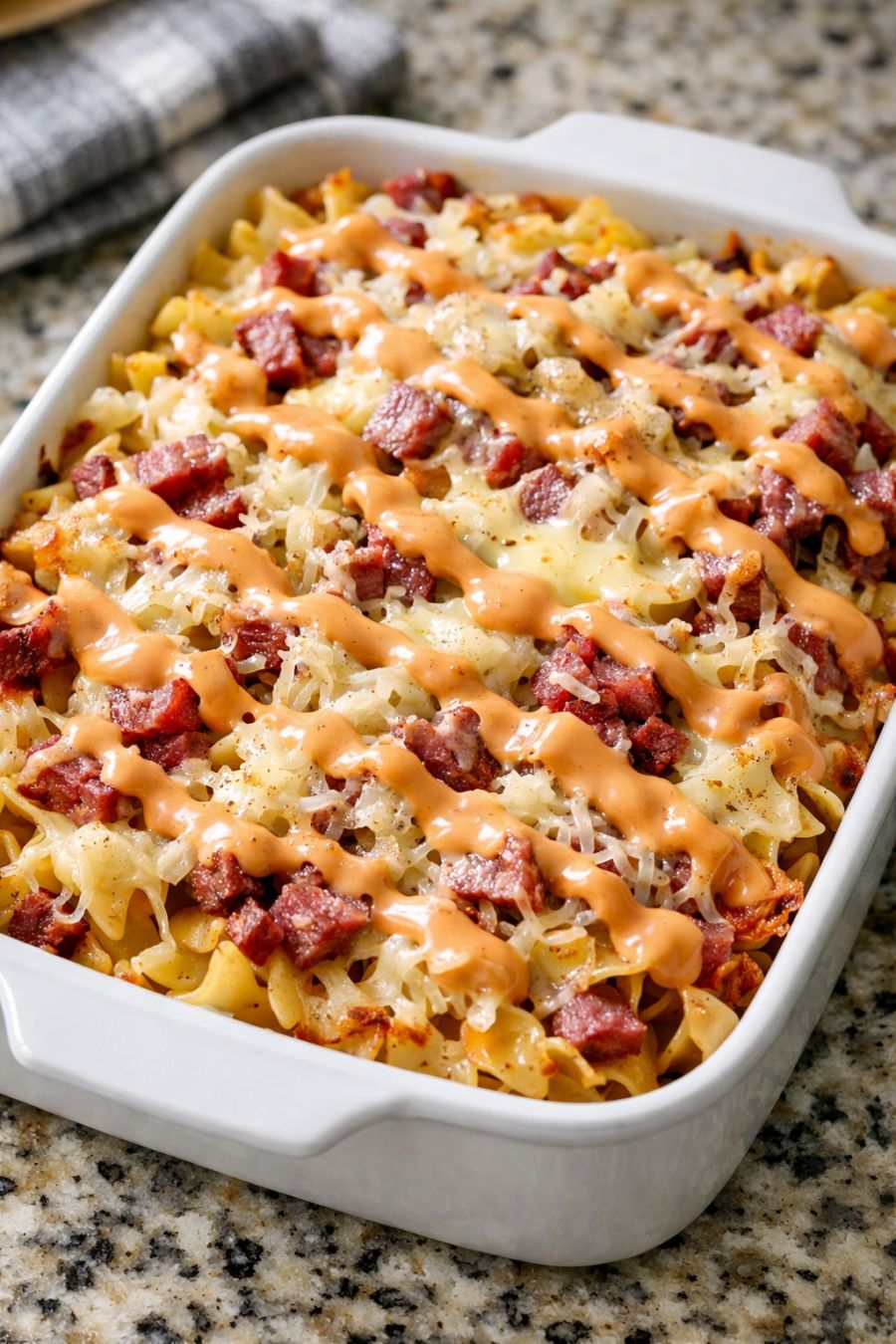 If your family likes things extra saucy, you can add a few tablespoons of milk or a splash of chicken broth over the noodles before pouring on the Thousand Island, just to give a little more moisture as it bakes. For a stronger Reuben flavor, tuck a few slices of rye bread, torn into small pieces, down into the noodles along with the corned beef, or serve the finished bake with toasted rye on the side. If you don’t have Swiss cheese, mild provolone or mozzarella will melt nicely, though you’ll lose a bit of that classic tang. You can also swap in pastrami for the corned beef if that’s what you have on hand. For a milder sauerkraut presence, mix half sauerkraut and half drained coleslaw mix before scattering it over the noodles. To make cleanup easier and ensure even cooking, give the noodles a quick toss with a cup of warm water in the dish before layering everything else, especially if your oven runs hot and tends to dry casseroles out. Leftovers reheat well, and a splash of extra Thousand Island over the top before reheating will freshen the flavors right up.