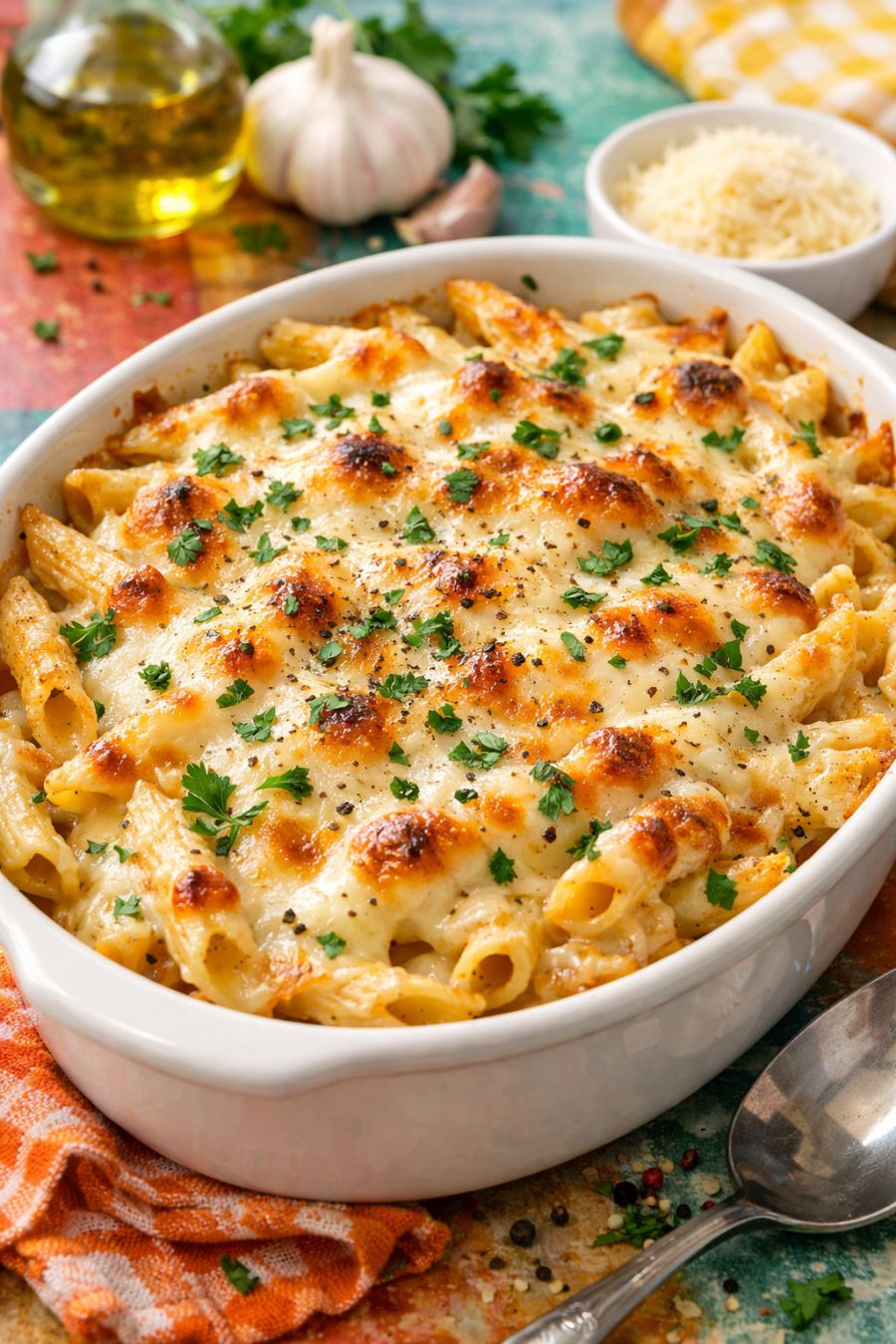 Remove the baking dish from the oven and let the pasta rest for 5–10 minutes before serving. This short rest allows the sauce to set slightly so it clings to the pasta instead of running.
